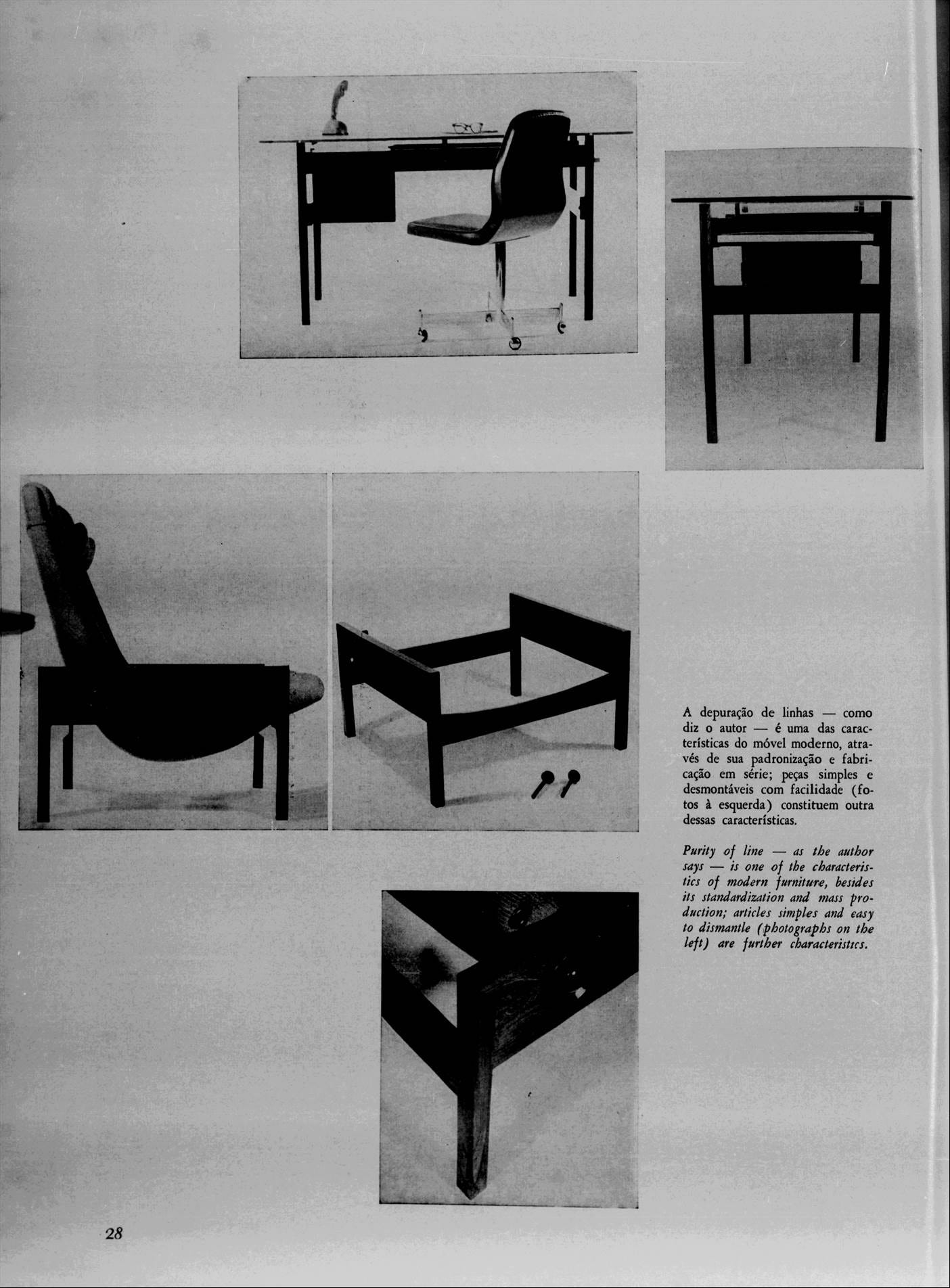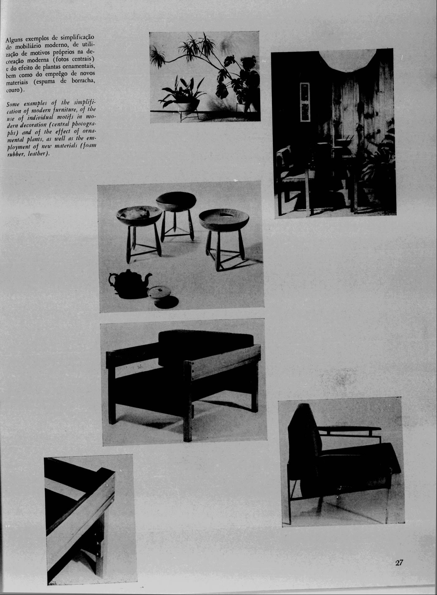 Plastic were developed during the war and only a few years after its end were introduced with success into industry, as were latex sponge and the light alloys perfected by aeronautical engineers. Wood is still the most economical raw material, since only now are plastic factories being set up. In Brazil, where we possess the best kinds of wood, we are continuing without worrying, waiting for the establishment of a plastic industry which will permit us to develop suitable models. Meanwhile, a collection was recently displayed in Rio of prototypes, i.e. articles recently taken from the drawing boards, and which have still do pass through technical and aesthetic perfecting. The sole object was show the efforts we have made in this direction towards making our contribution in the sphere of household equipment. Photographs show clearly the models to which we refer, in wood and metal, special fabrics and leather, as well as sponge rubber (which will go far towards lowering the cost of stuffing), applied in a simple and sincere manner, stressing the constructive system and enhancing the beauty of the material employed.